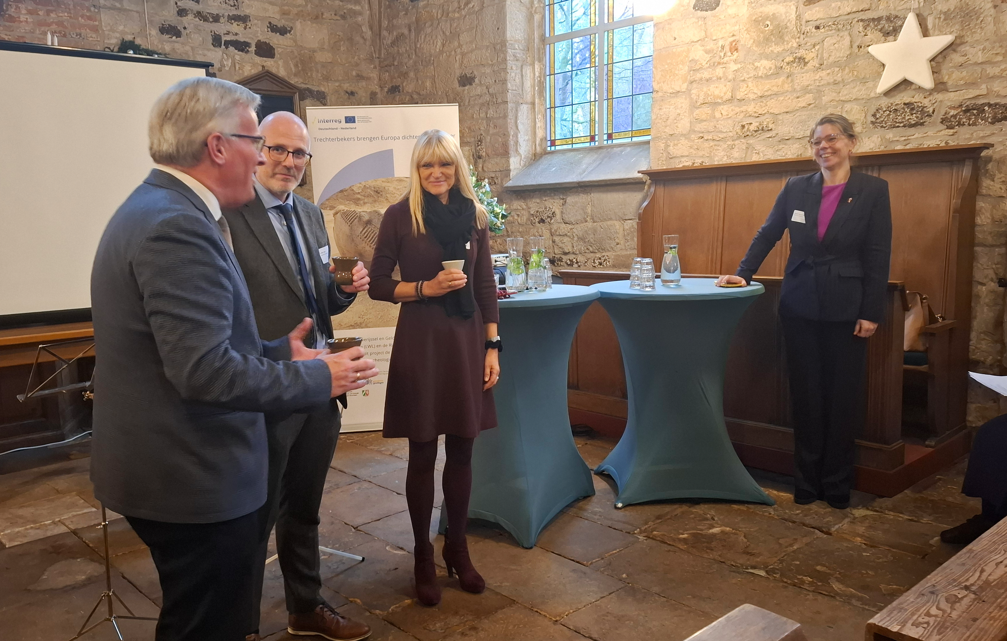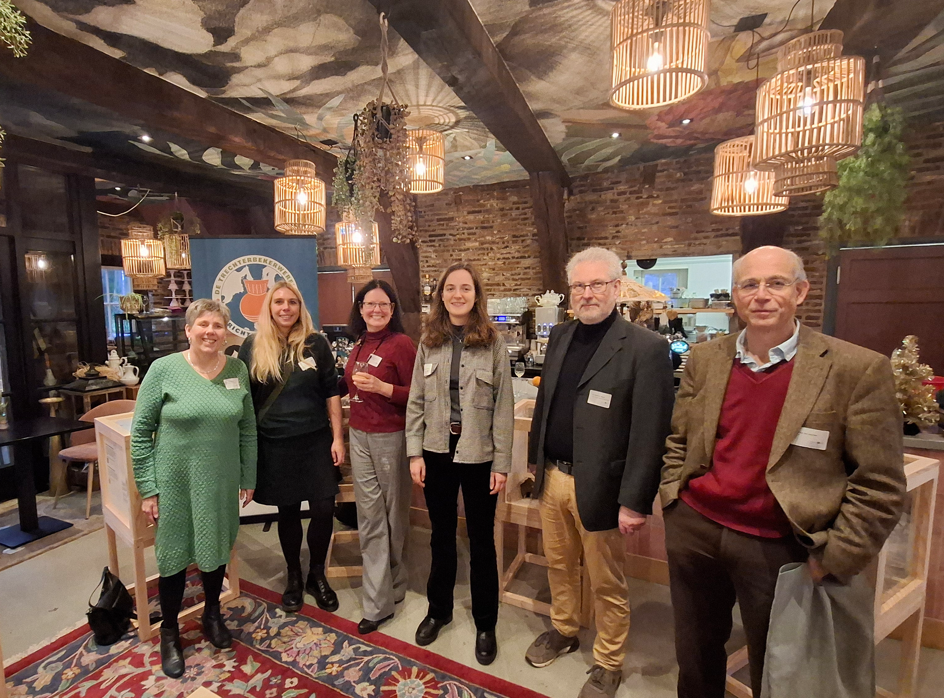 Nach einer Begrüßung durch Gert Harm ten Bolscher, Abgeordneter der Provinz Overijssel, nahmen wir ein kleines Mittagessen mit niederländischen Spezialitäten zu uns. In zwangloser Runde tauschten wir uns dabei über typische Weihnachtsbräuche und Festessen aus. Die weihnachtliche Stimmung setzte sich anschließend im zweiten Teil der Veranstaltung fort: In der adventlich geschmückten Stiftskirche erwartete uns ein Plenum zu den Erfolgen und Zielen des Trichterbecher-Projekts. Die Moderation übernahm unsere Kollegin Ingrid Groenewegen. Zur Erleichterung der Kommunikation war eine Echtzeit-Dolmetscherin vor Ort, deren Übersetzung über bereitgestellte Kopfhörer empfangen werden konnte. Ein Ensemble junger niederländischer Musiker*innen, die beide in Deutschland studiert hatten, sorgte für musikalische Begleitung. Neben einzelnen Projektmitarbeiter:innen kamen auch verschiedene Stakeholder:innen zu Wort. So äußerte Dr. Barbara Rüschoff-Parzinger, Kulturdezernentin des LWL, ihre persönliche und wissenschaftliche Freude über den deutsch-niederländischen Austausch. Ten Bolscher betonte den Wert grenzübergreifender Zusammenarbeit. Als Mike Rose, der Förderbeauftragte der Universität Groningen, zu Wort kam, waren wir Deutschen ganz aufgeregt: Niederländisch mit englischem Akzent konnten wir wunderbar verstehen!