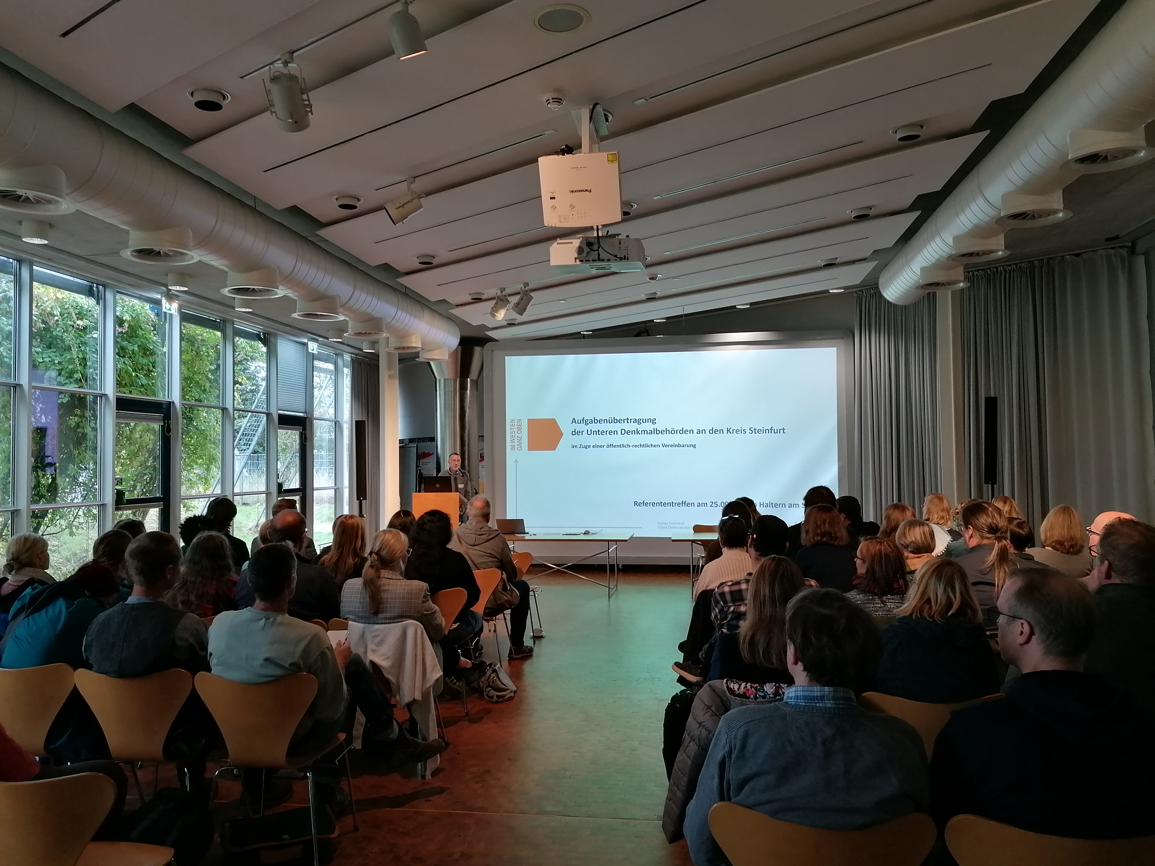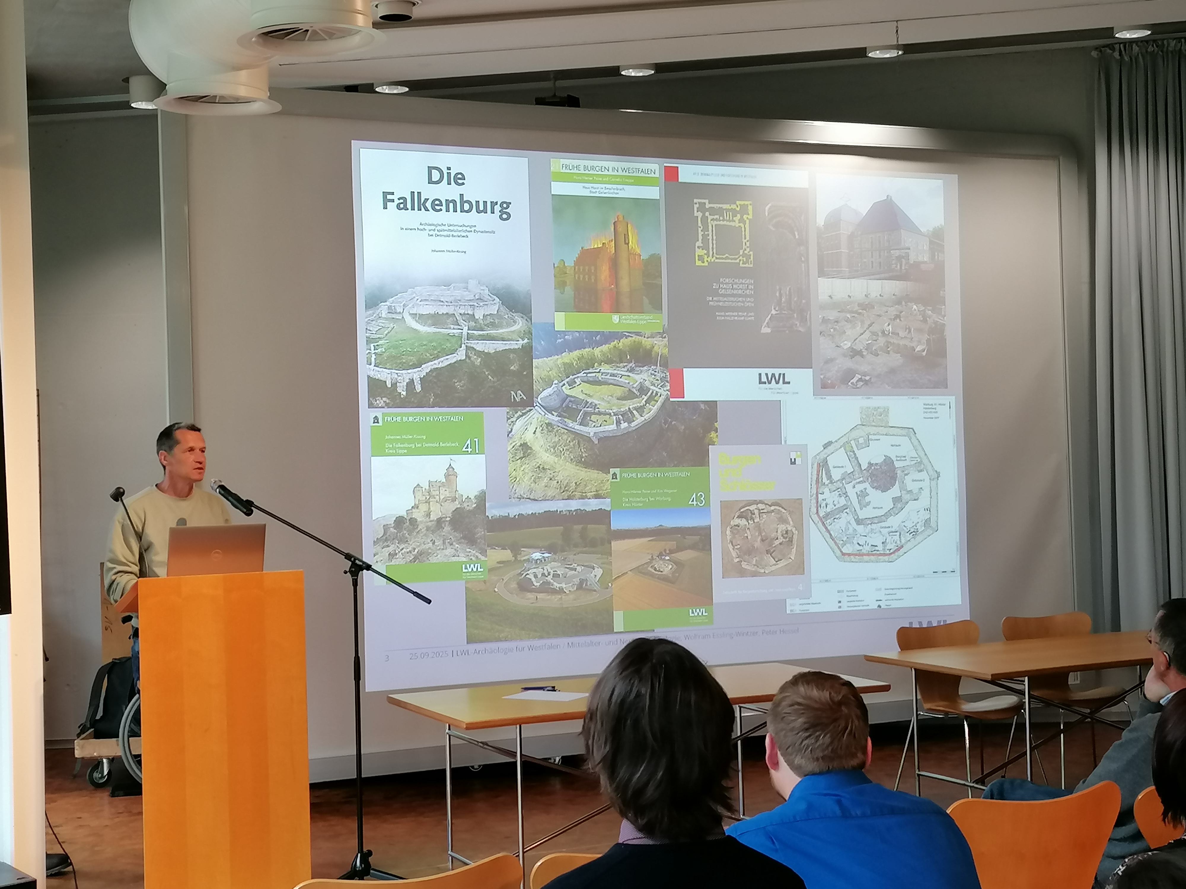 Nach einer kurzen Begrüßungsrunde durch Prof. Dr. Michael M. Rind, Dr. Erich Claßen und Dr. Sandra Peternek sprach Rabea Everwand von der Oberen Denkmalbehörde des Kreises Steinfurt. Sie berichtete über den Stand der Aufgabenübertragung der Unteren Denkmalbehörden an den Kreis, die im Zuge der Novellierung des Denkmalschutzgesetzes bereits seit Juni 2022 möglich ist. Daran anknüpfend referierte Dr. Kai Niederhöfer über die Denkmallistenführung, die in NRW seit Beginn 2025 nicht mehr den Unteren Denkmalbehörden, sondern den Denkmalfachämtern obliegt, und den Umgang mit Altverfahren zu eingetragenen Bodendenkmälern.