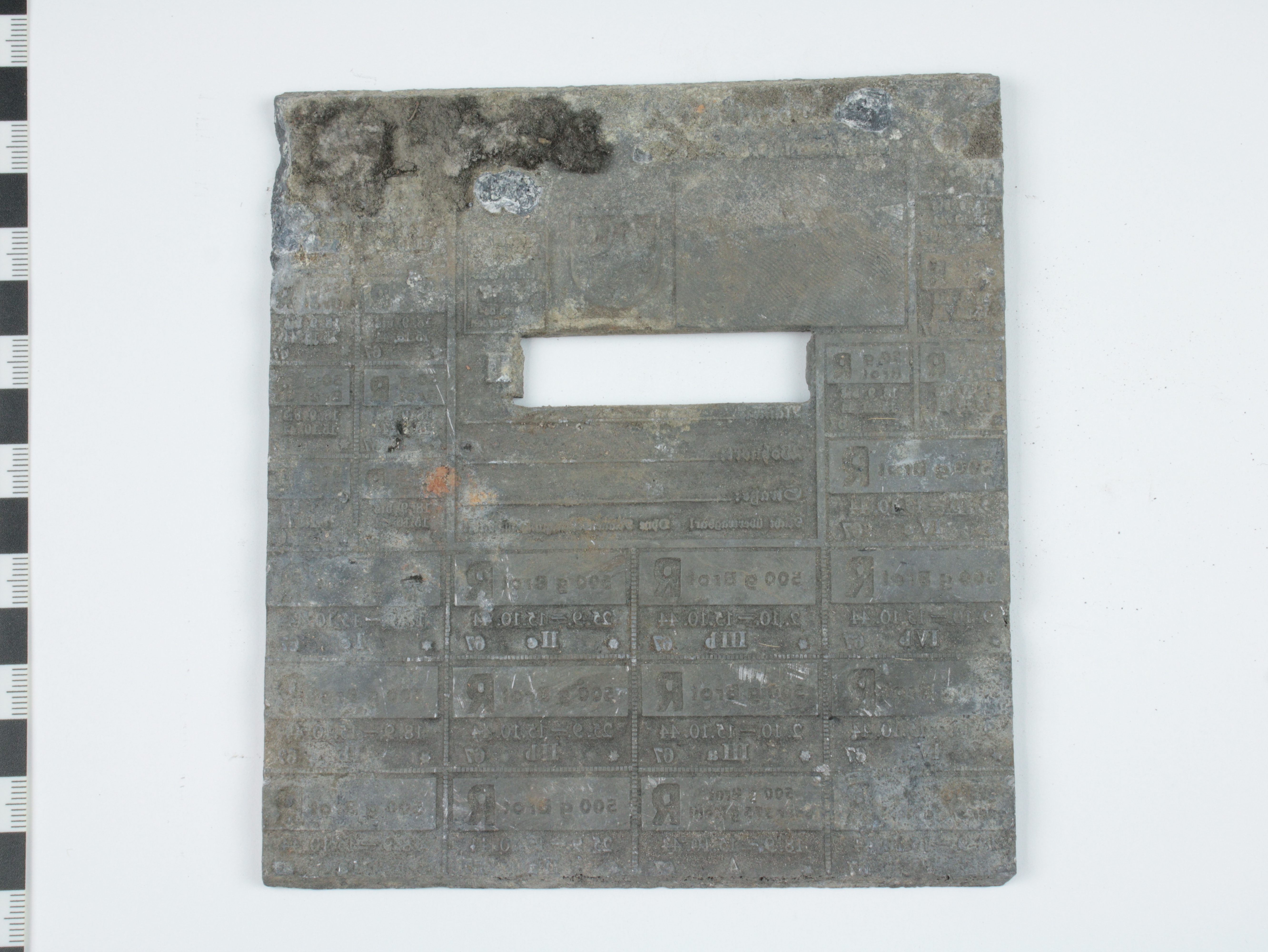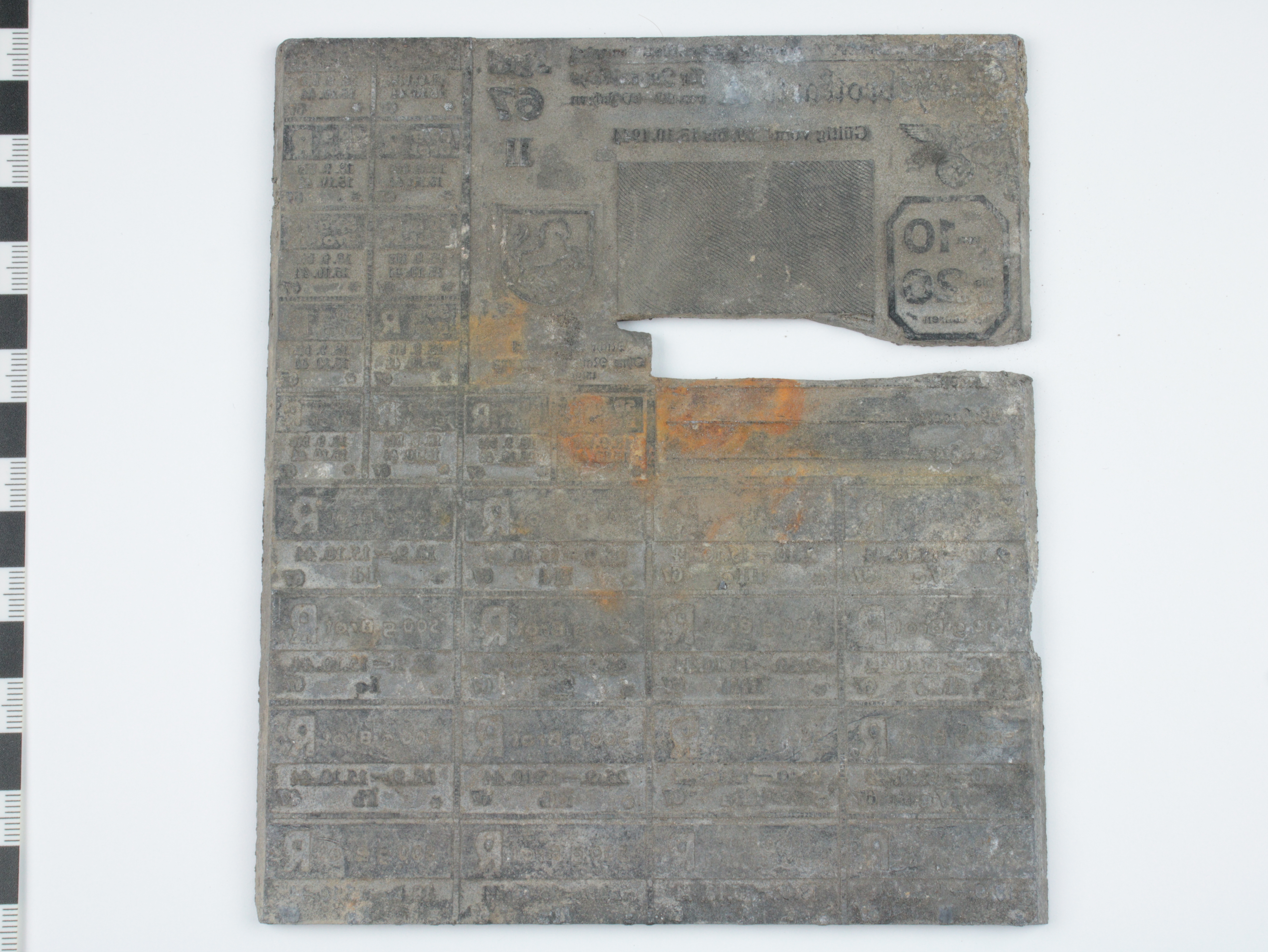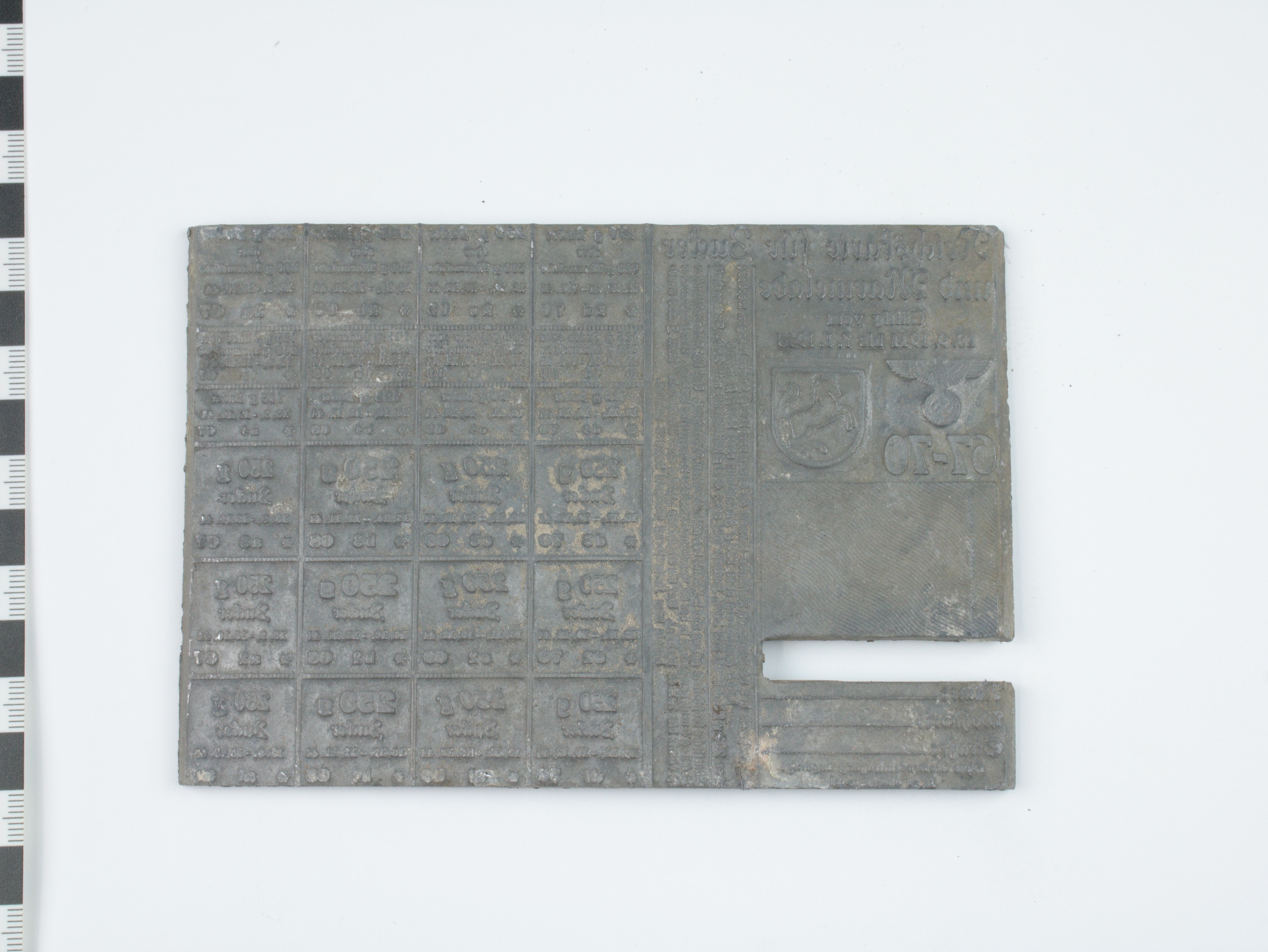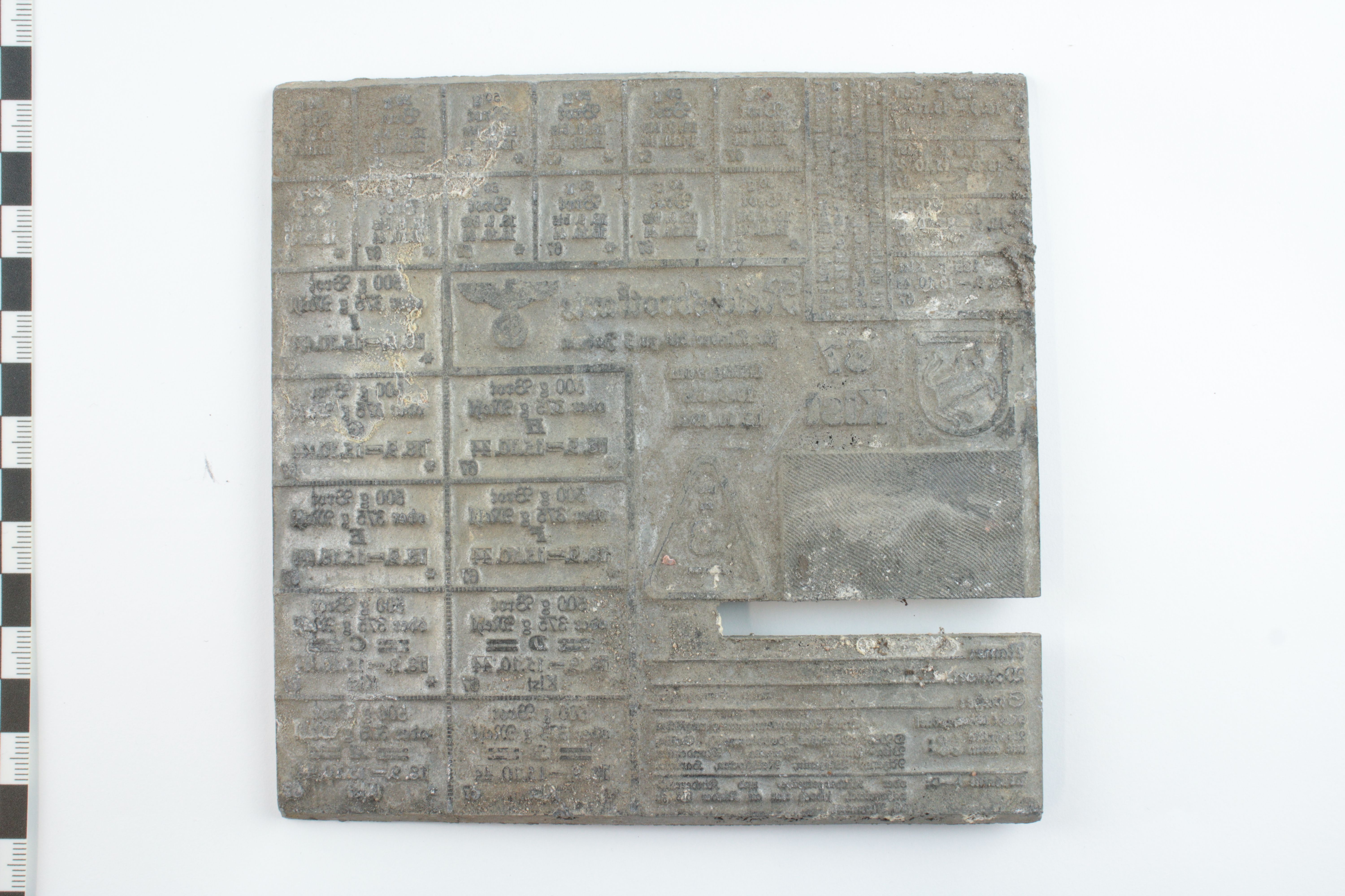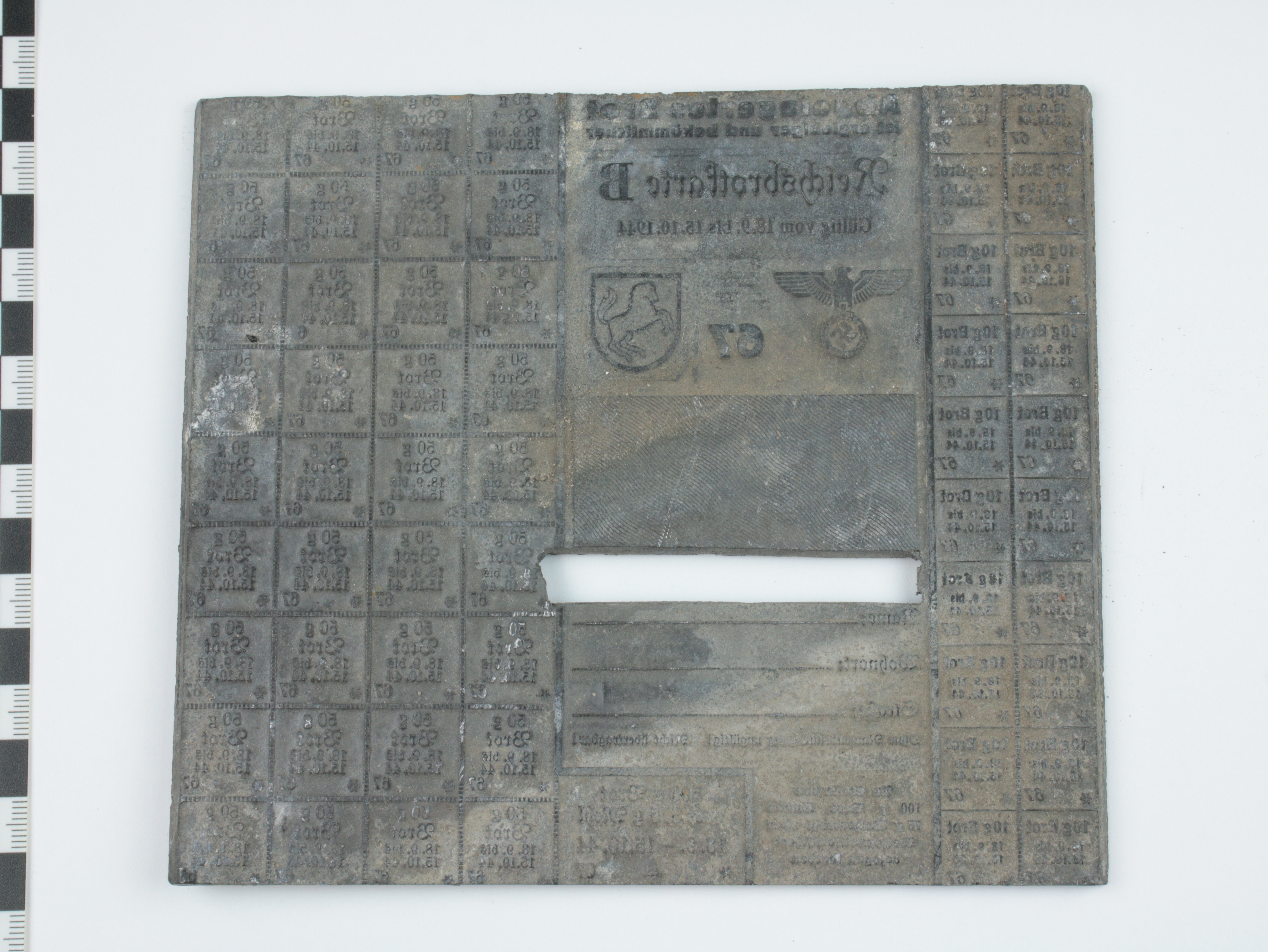 Weitere zwei Druckplatten für Brotmarken fielen mir wegen der Mengenangaben auf: eine mit 500 g-Marken und eine mit 50 g-Marken. Spontan kamen mir die Fragen: Wer soll von 50 g Brot leben und kann es sich um einen Produktionsfehler gehandelt haben? Da die Druckplatte zu benutzt für einen Produktionsfehler aussieht, habe ich recherchiert: Bekannt ist, dass Lebensmittelkarten im Zweiten Weltkrieg erstellt wurden, um Nahrungsmittel zu rationieren. Unterschiedliche Personengruppen erhielten für einen definierten Zeitraum unterschiedliche Mengen an Nahrung. Die Personengruppen wurden unterteilt nach Alter, Religion Gesundheitszustand und Tätigkeit. (Quelle: https://hdgoe.at/lebensmittelkarten). Die unterschiedlichen Mengen sind somit wahrscheinlich durch verschiedene Personengruppen zu erklären.