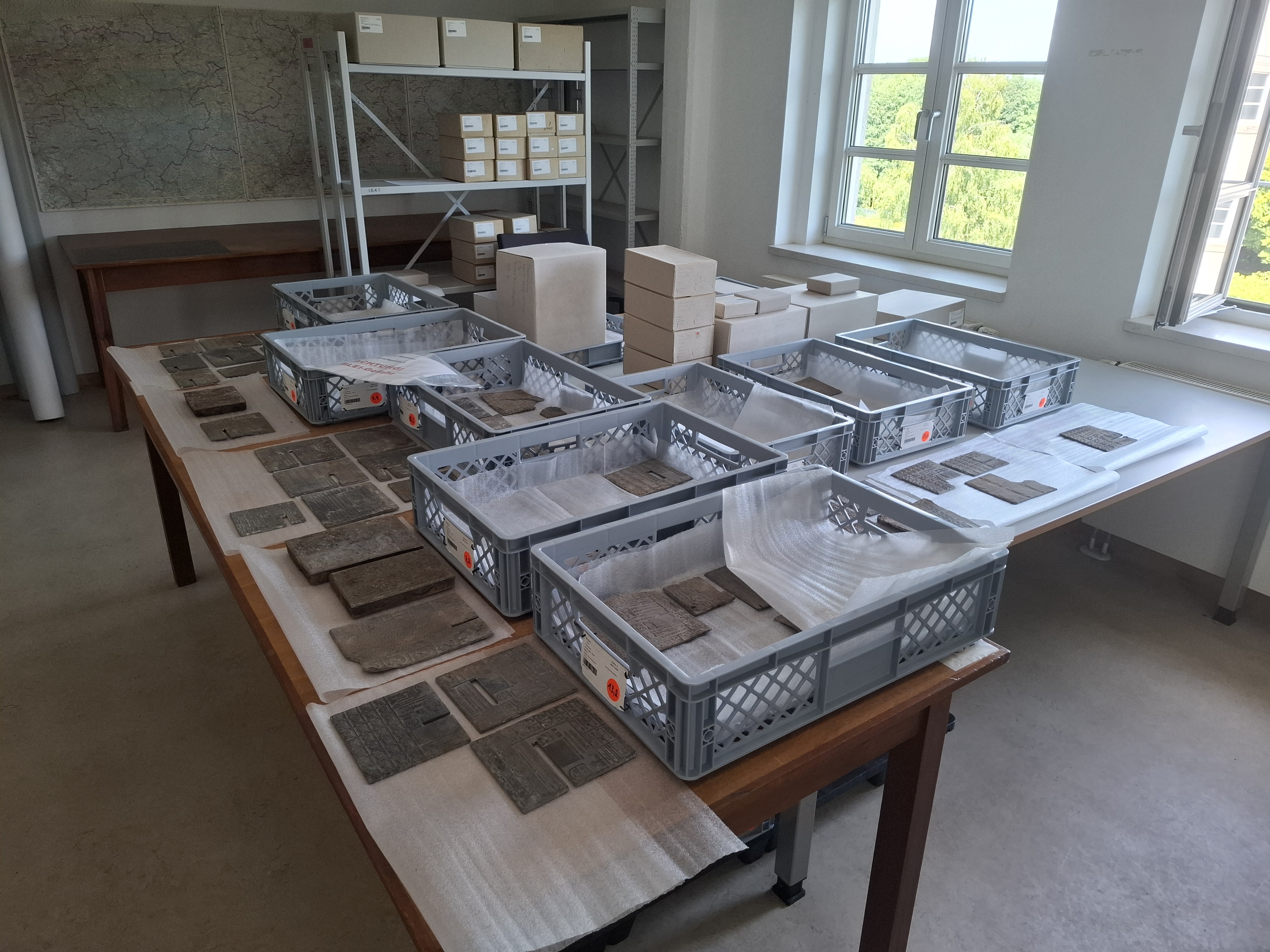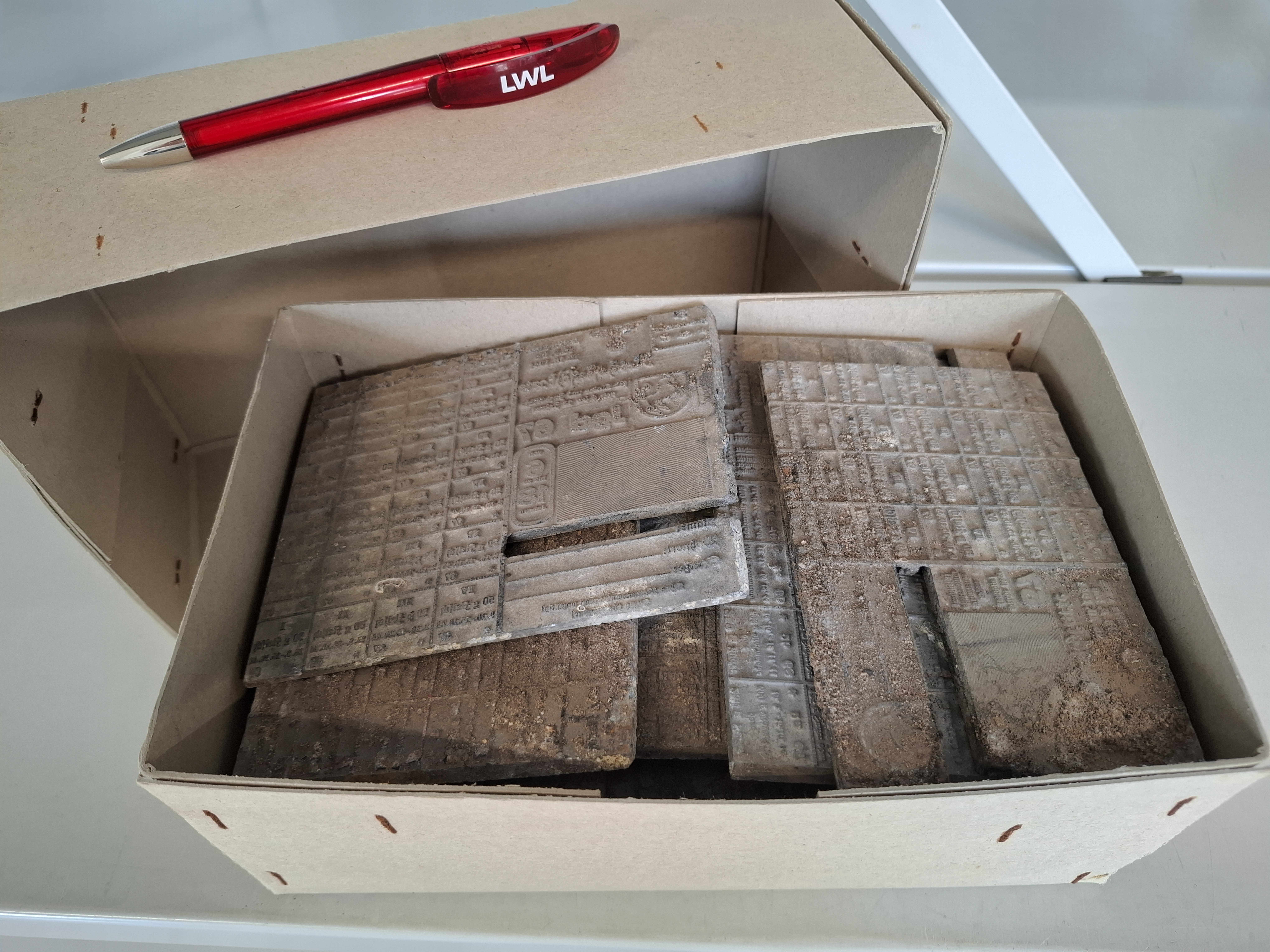 Übrigens kann man drei solcher Druckplatten in unserem LWL-Museum für Archäologie und Kultur in Herne besichtigen. Sie stammen aus dem Schutt der 1944/45 ausgebombten Druckerei Regensberg neben dem Domplatz in Münster. Da auf dem Karton im Fundarchiv der Fundort „Münster ?“ vermerkt ist, liegt die Vermutung nahe, dass auch diese Druckplatten von dort stammen.